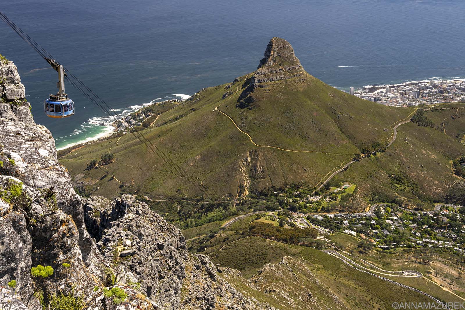 The view of Lions Head and the cable car from the top of Table Mountain.