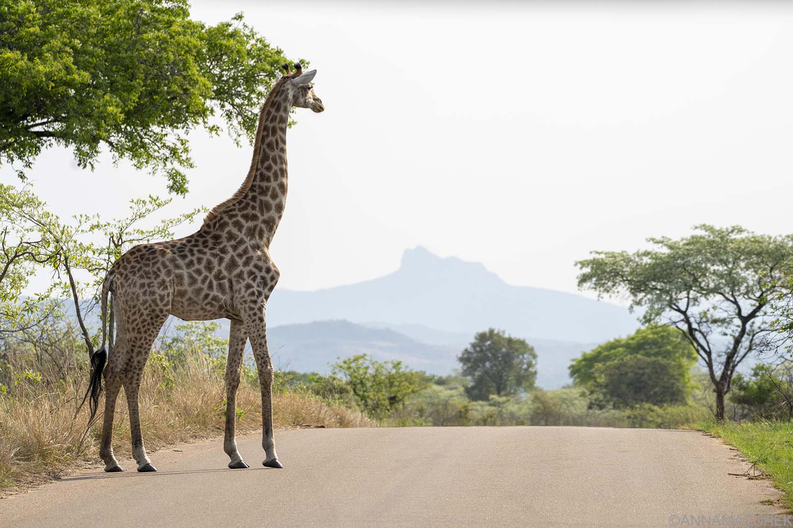 A giraffe walks across the road in the southern part of Kruger National Park.