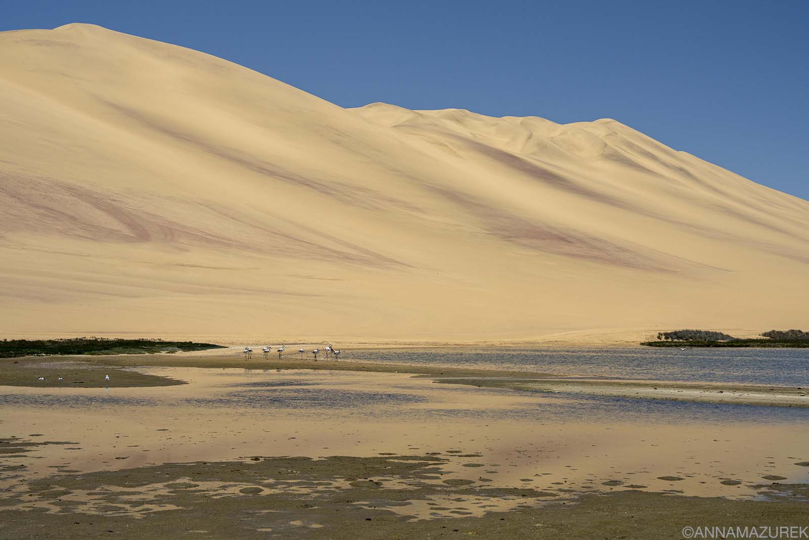 Flamingos and giant sand dunes in Sandwich Harbor along the coast of Namibia.