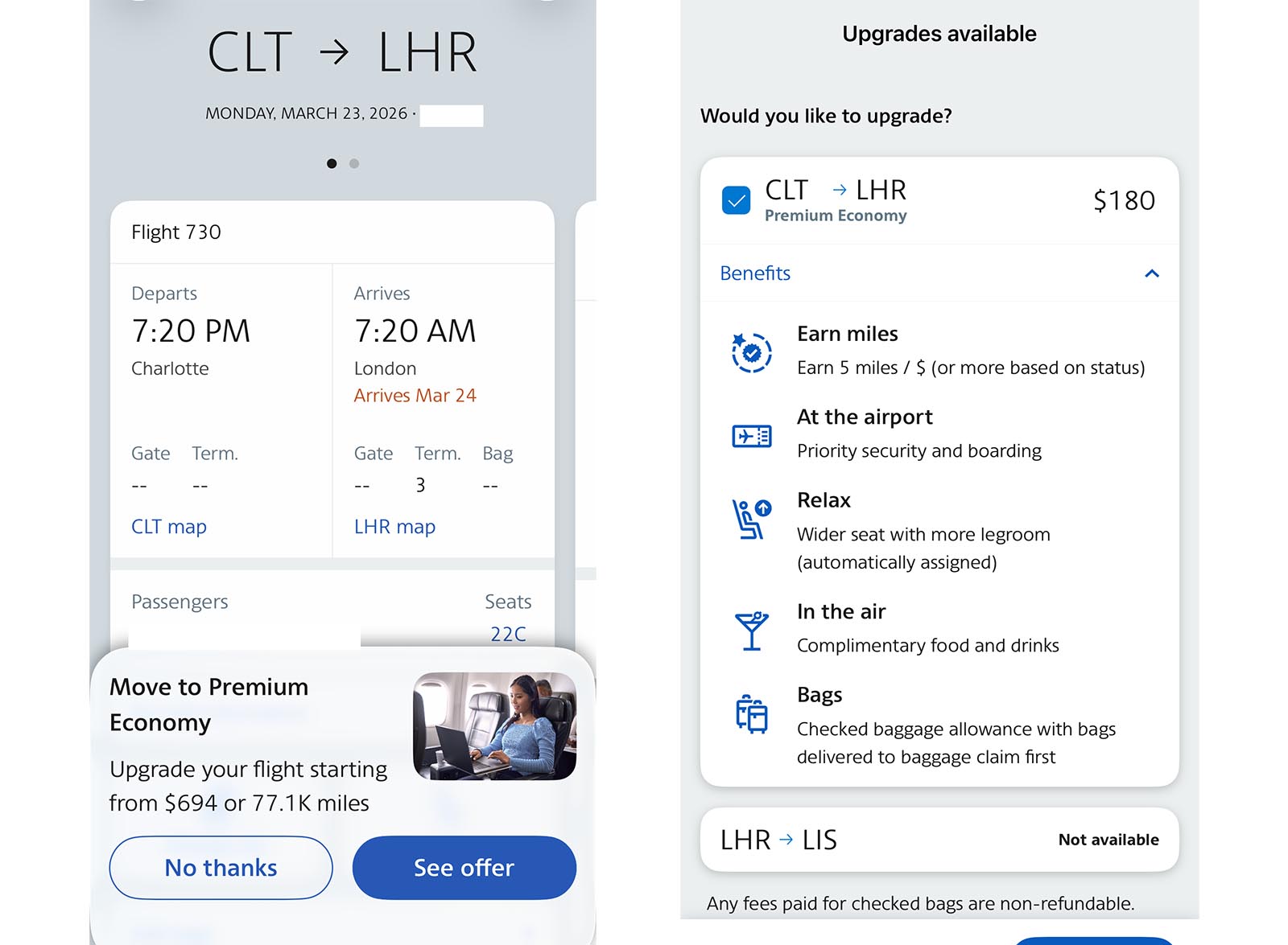 The screenshot on the left shows the ridiculous upgrade cost for premium economy in advance on a flight from CLT to LHR, while the right image shows what I was offered at checkin for a middle seat.
