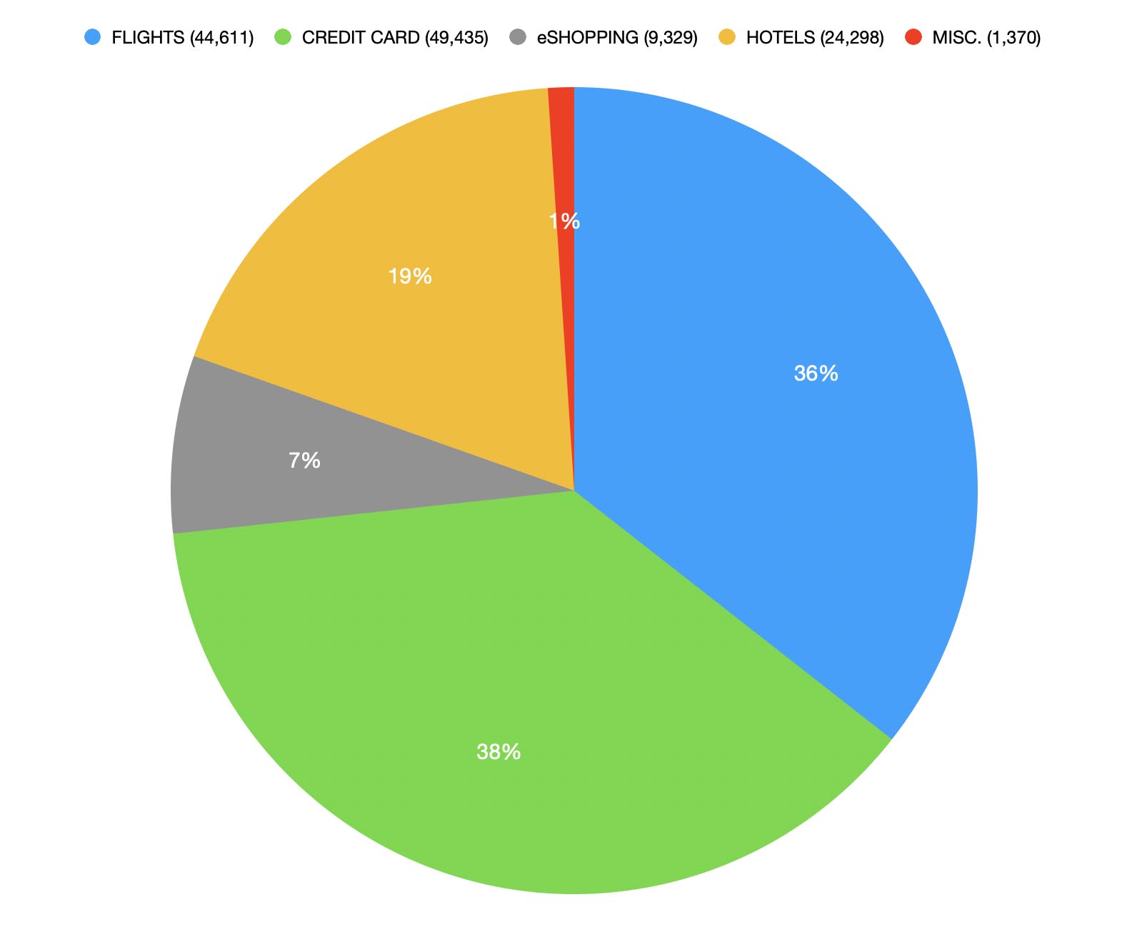 To achieve American Airlines Platinum Pro status in 2025, I earned 131,043 loyalty points from the following: Flights (36%; 46,611), Credit Card Spending (38%; 49,435), Hotels (19%; 24,298), eShopping ( 7%; 9,329) and miscellaneous (1%; 1,370 from rental cards, Simply Miles and the 1,000 point loyalty bonus once you reach 15,000 points.)