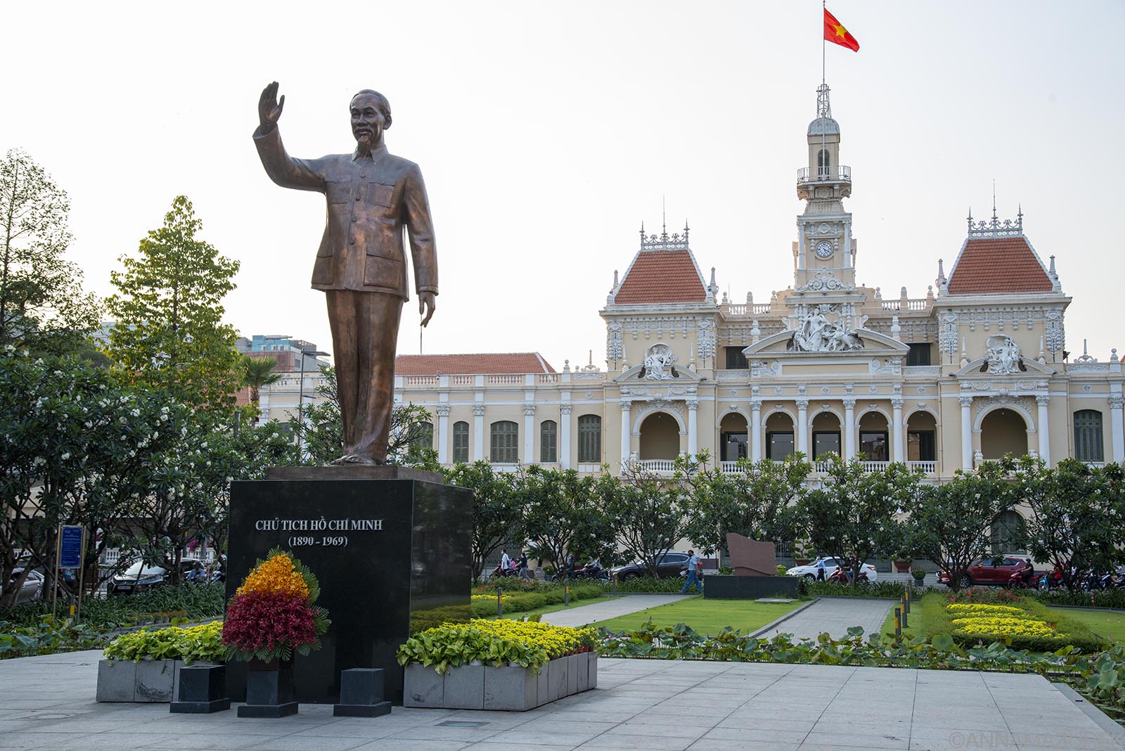 A statue of Ho Chi Minh sits outside the People’s Committee of Ho Chi Minh City building on Nguyen Hue Walking Street.