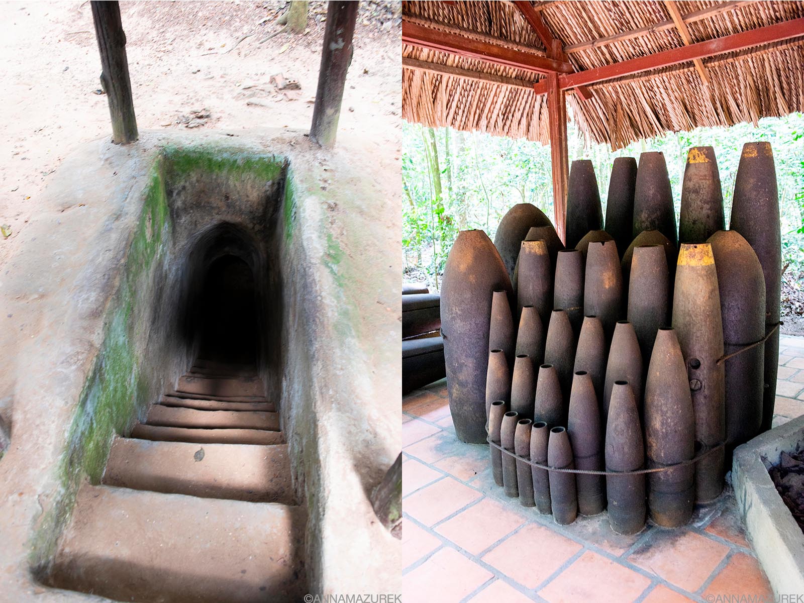 Left: The entrance to one of the Ben Douc tunnels, part of the Cu Chi Tunnels. Right: Artillery left over after the Vietnam War.