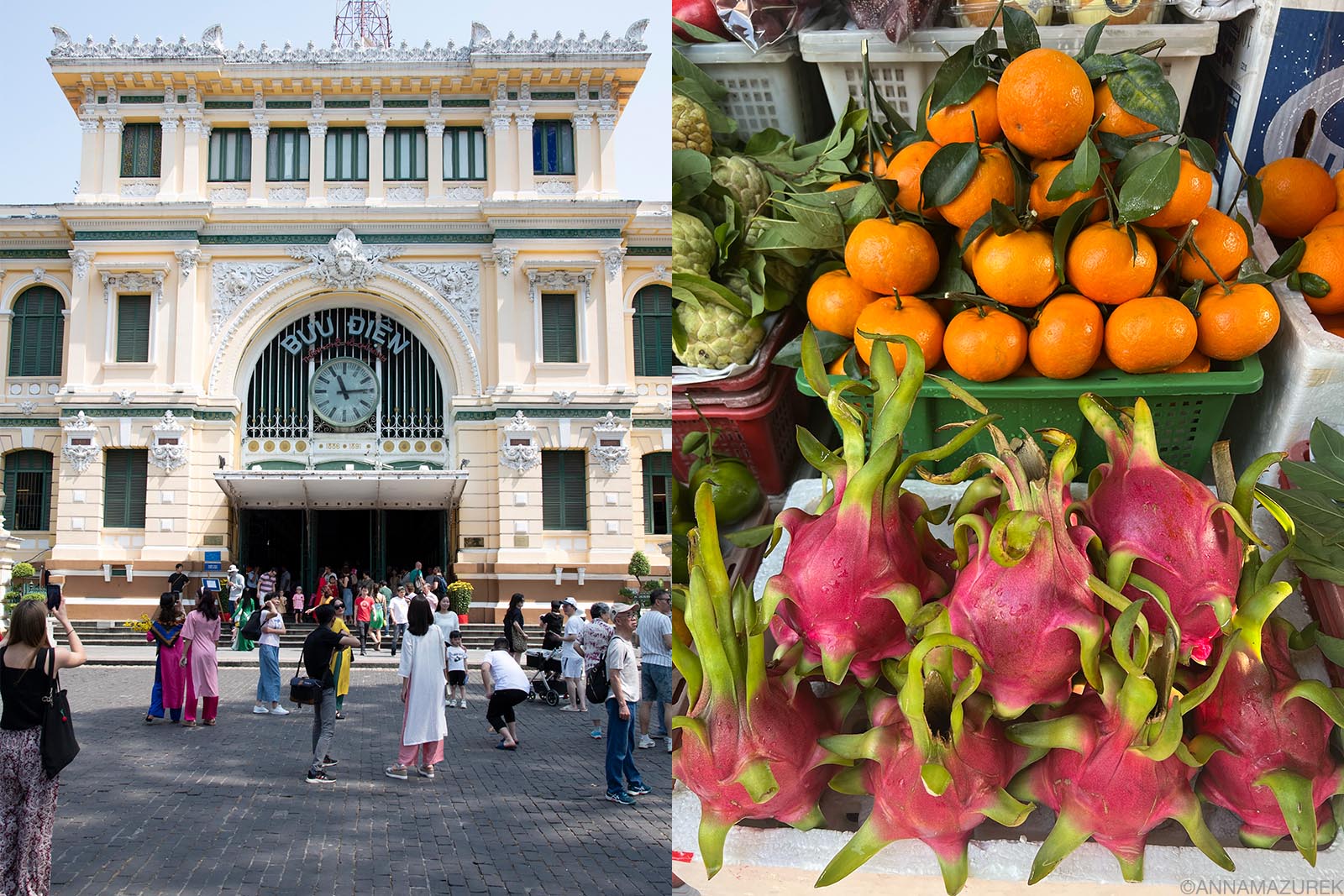 Left: The Central Post Office. Right: Fruits for sale at the Ben Thanh Market.
