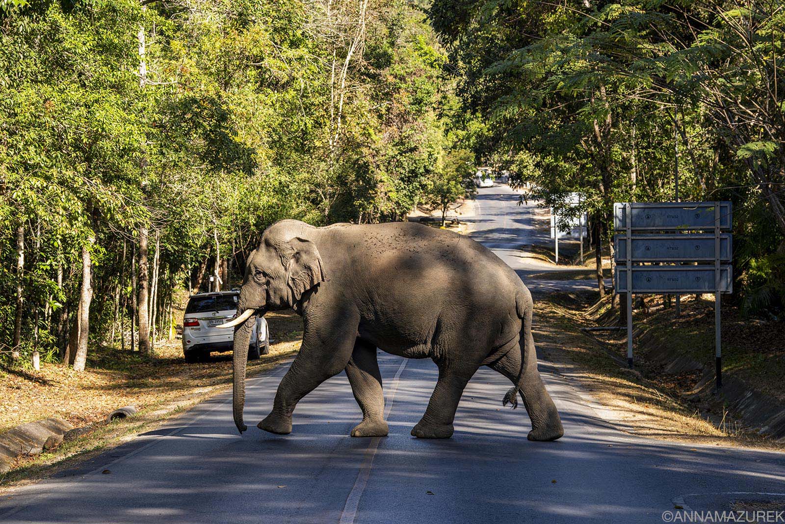 porcupines and countless other bird species on our forest treks. We had a tasty lunch in the park that we had preordered and visited the 25-meter tall Haew Suwat Waterfall. Wildlife sightings are not guaranteed, but we had two epic wild elephant sightings back-to-back.