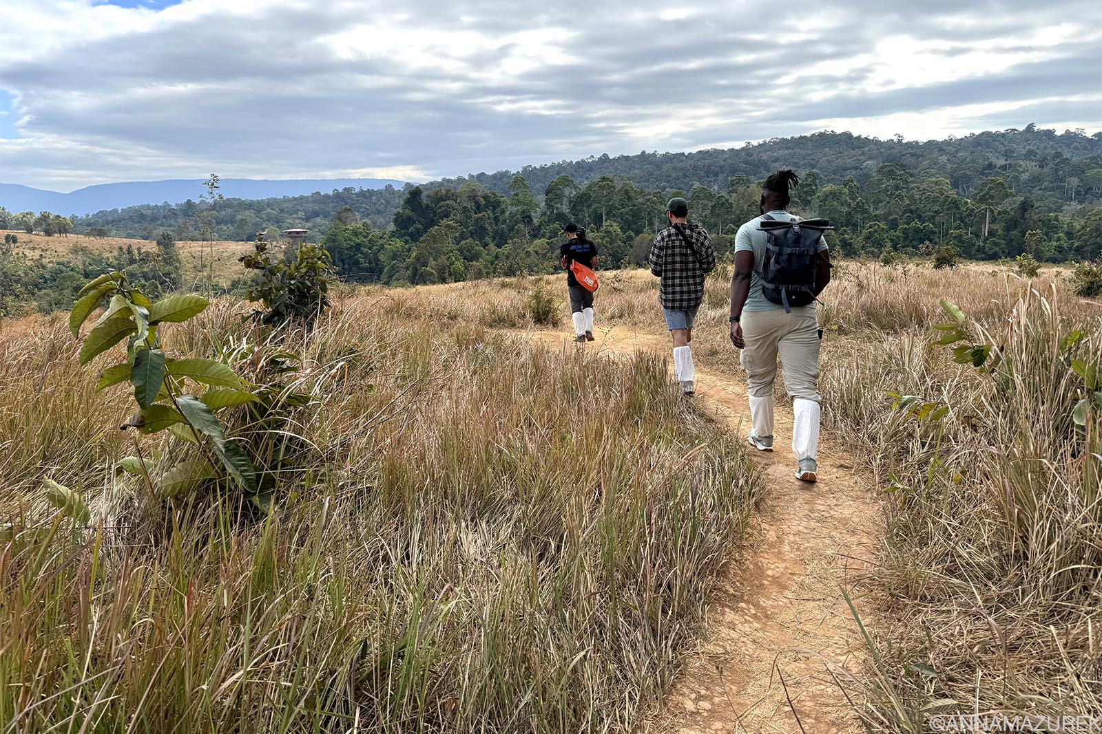 Hikers wearing tick socks trekking along the trails with a guide at Khao Yai National Park.