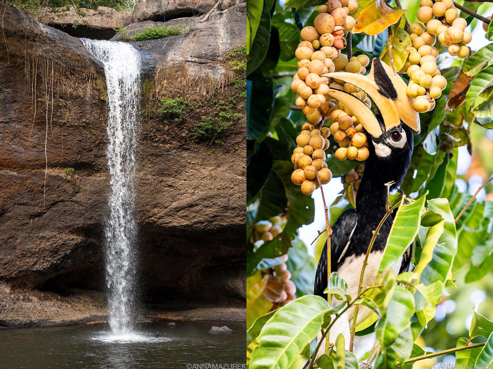 Left: The 25-meter tall Haew Suwat Waterfall Right: A hornbill at Lam Ta Khong Campground.