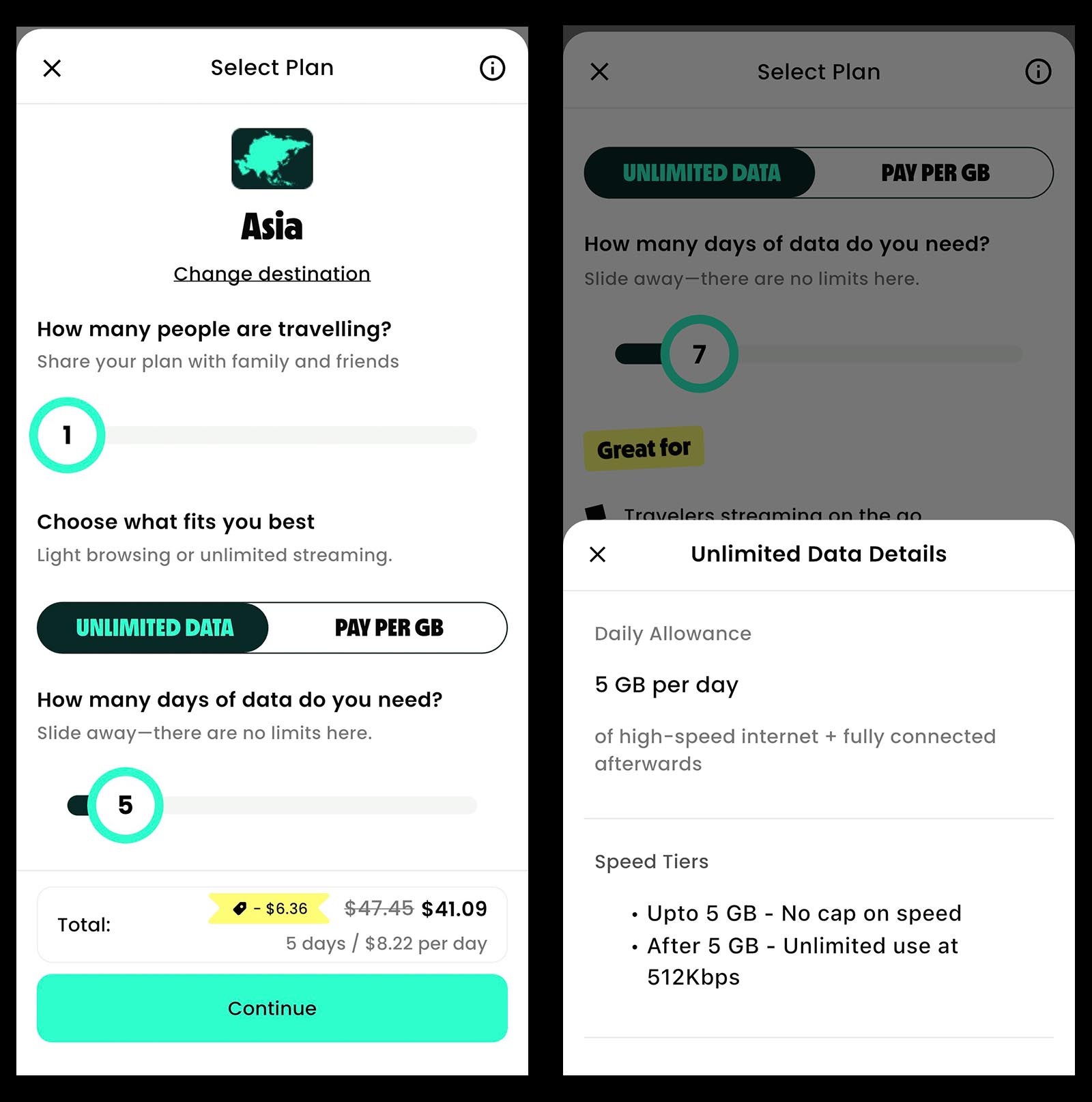 For unlimited plans, Truely allows you to select the number of days needed (left) and offers full transparency on data speeds (right).
